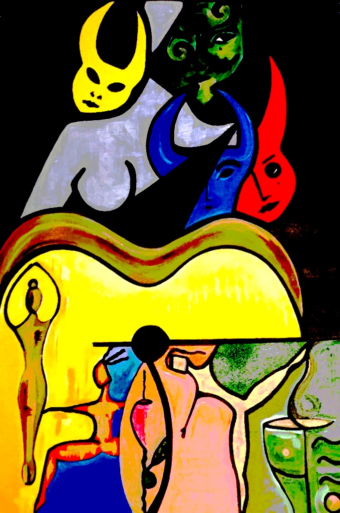 Por supuesto que eso no lo hago con todos mis cuadros, ya que todos están a la venta y poco me importan las razones por las cuales alguien me compra uno, pero con este cuadro rompí todos los esquemas. En este lienzo conceptualisé la epítome de la celebración al dios griego Dionisio, (el Ditirambo), ya que el es el dios del vino y el vino es algo que me interesa y me gusta mucho. Este proceso sistematico y sintetico hizo que se haya ampliado en progresión geométrica la razón de ser de este cuadro. Su estilo es el simbolismo-surrealista hecho en forma expresionista-abstracta.*