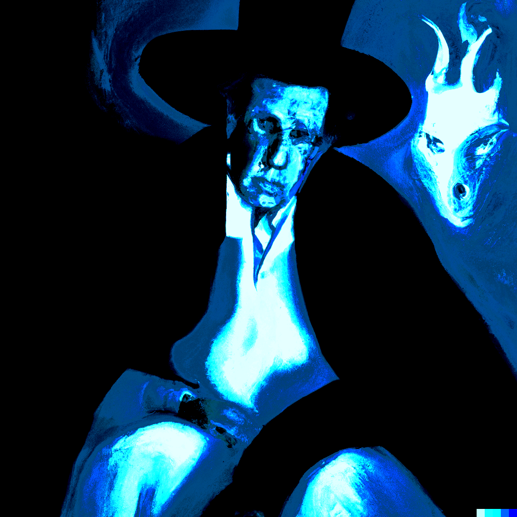 * This painting depicts the artist (I thought about doing a portrait of Francisco Goya) in a pensive mood, seemingly floating on the blue waters of a «creative» sea, while the «muse» looks from the side, taking on a rather sinister appearance…