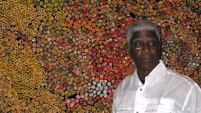 He is mostly known for his «bottle-top installations» which he makes out of thousands of pieces of aluminium which he gets from alcohol recycling stations. He sews them together with wires of copper and transforms them, artistically into sculptures seemingly of cloth.