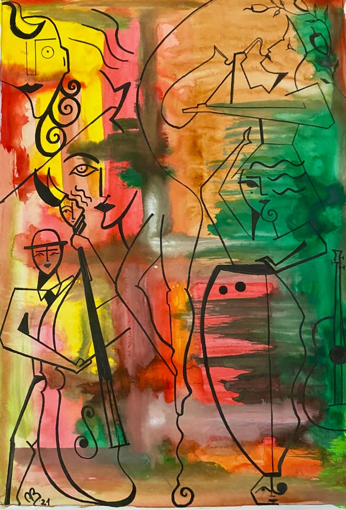 First, I start by imagining the composition, in other words, visualising it vividly in full detail as I listen to some jazzy tunes; I begin to sketch to the music, following the rhythm and the nuances of the melody; I allow the sketch to «climb up to the canvas» in colours that resemble the chords and the harmonies that I am listening to; then I improvise instead of simply copying the sketch and I let my «soloist» (usually one of the figures within the composition) to lead me on, to tell me the colour, to compose a bit; then I balance the colour wheel within the composition so that it can dance…