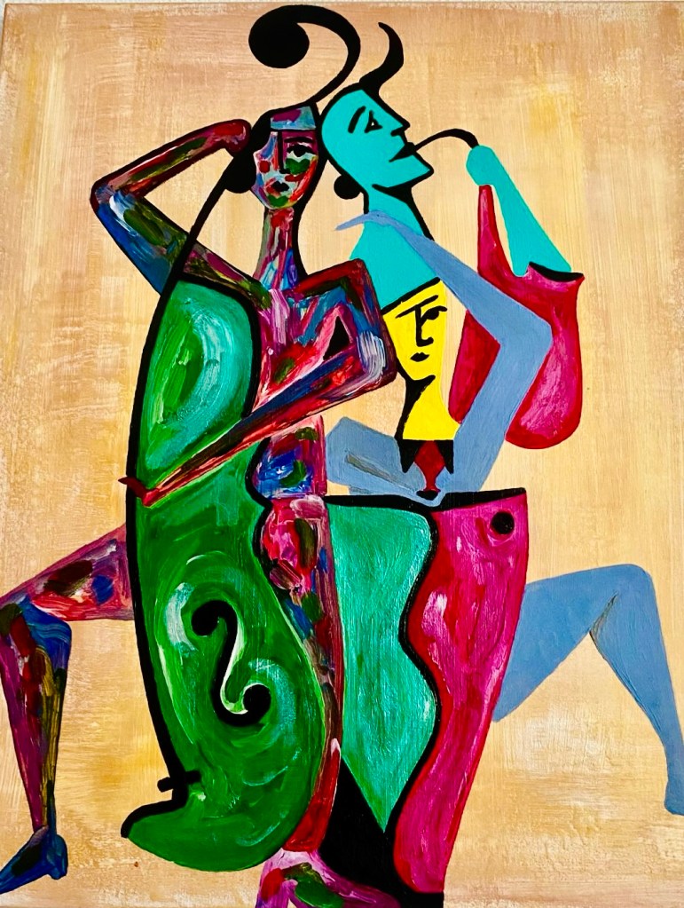 El tercero…y último…es un cuadro que he titulado «Fiesta». La técnica, acrílico sobre tela y mide 50x60cm. Se imponen, sobre un fondo abstracto dominado por los colores rosas y amarillos, cinco siluetas, tres bailando, una haciendo unos movimientos gimnásticos y uno tocando un tambor. Se palpa el movimiento en la composición, se sienten los golpes en el cuero del tambor, se respira la alegría de los bailarines y de todos…