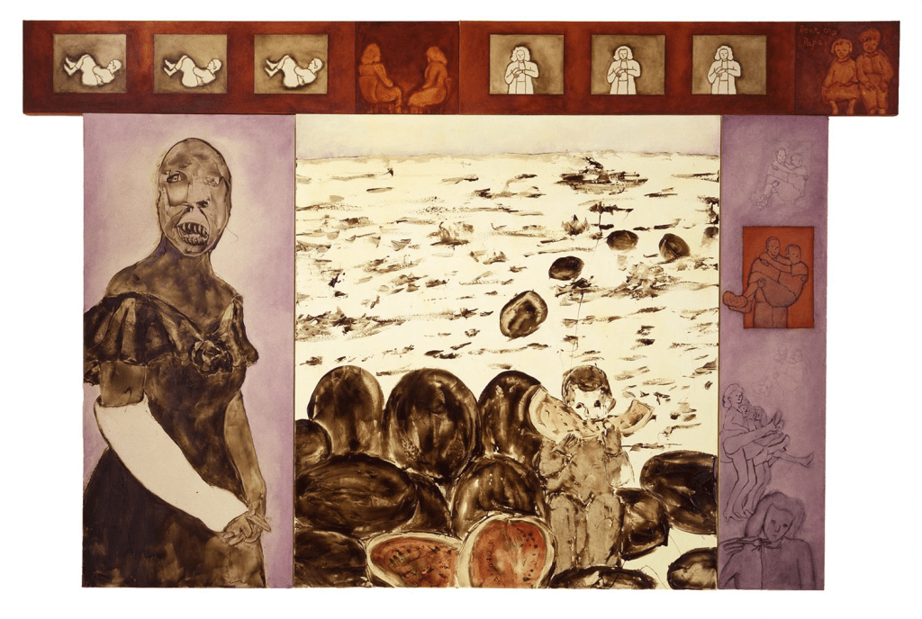 She died a few days ago… She was born on November 11, 1929, in the Bronx, (New York). Her name is Ida Applebroog, daughter of Orthodox Jewish parents, she studied graphic design in Manhattan, stating that she did it because she needed to earn money… She was a feminist, a painter, designer, illustrator of children’s books, and a prolific writer… After moving, with her husband and four children, to Chicago, she enrolled in The School of the Art Institute of Chicago and devoted herself to making jewellery and costume jewellery for the family to sell at art fairs in the city… In 1968, the family moved to California and she began attending art classes at the California Institute of the Arts, which is when her painting style began to develop. Her first exhibition (mixed) was in 1972 at the Long Beach Museum of Art (California)…
