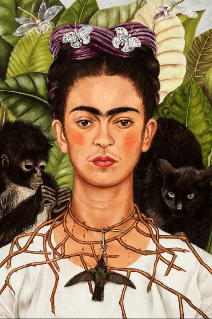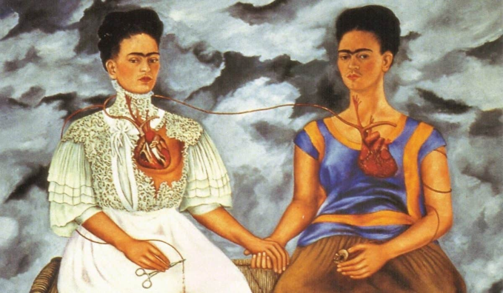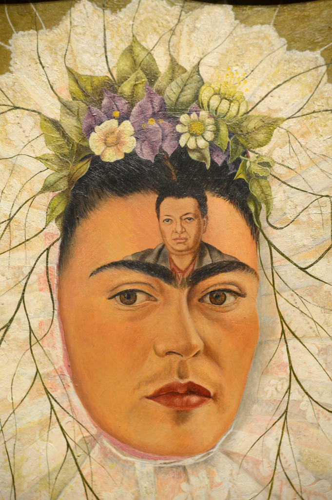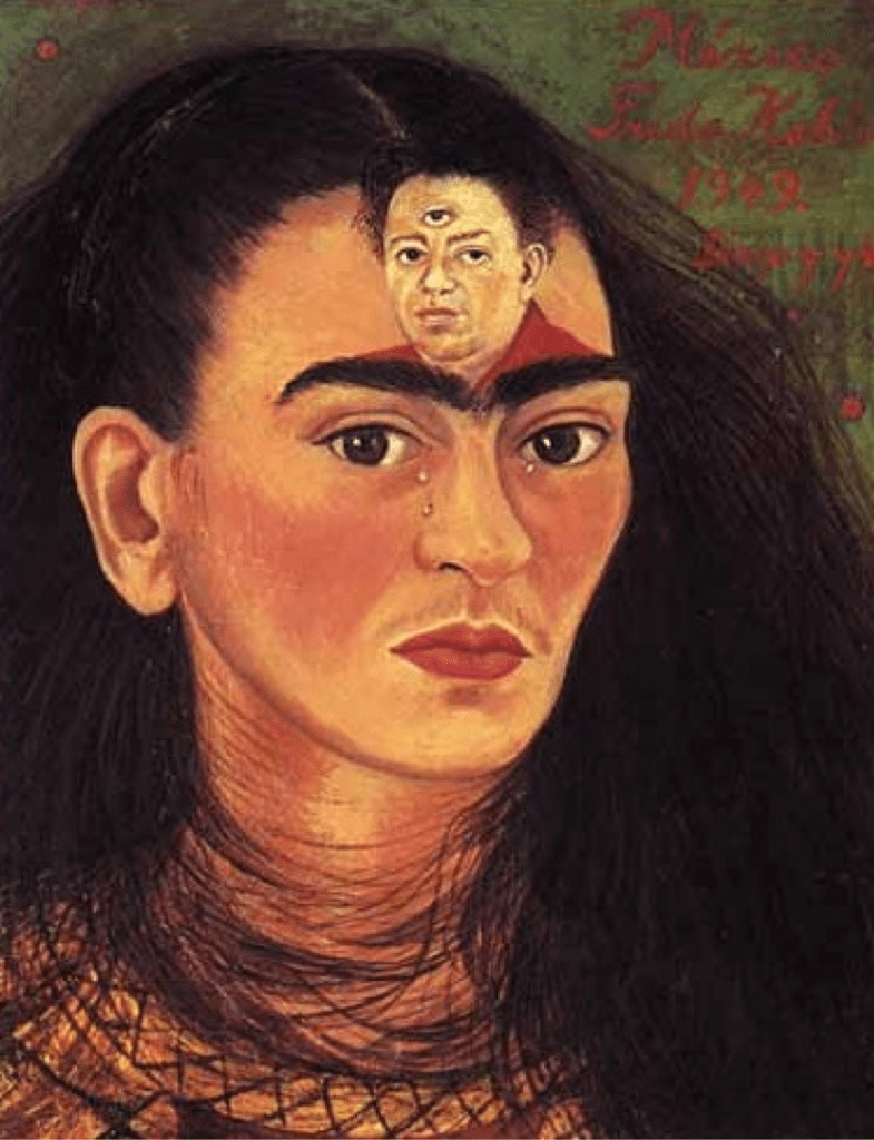 Three: Well, a lot of women think of her as a feminist icon. I do not really understand that one at all. Frida was submissive. If you read her diary you can read her own words of submission to Diego Rivera. Being in love and passionate about a man or a woman does not detract from feminism, but being submissive to another does. Why? Because when you submit you are recognising that the object of your submission is a superior being and that you are lesser in their eyes…and in status…and you must submit to gain approval and acceptance. That is not a good human trait, for women or for men. And this is evident in the portraits she painted of herself and Diego Rivera. There are several (at least two) where she places his face on her forehead and paints a third eye on Diego, thereby making him a god of sorts.