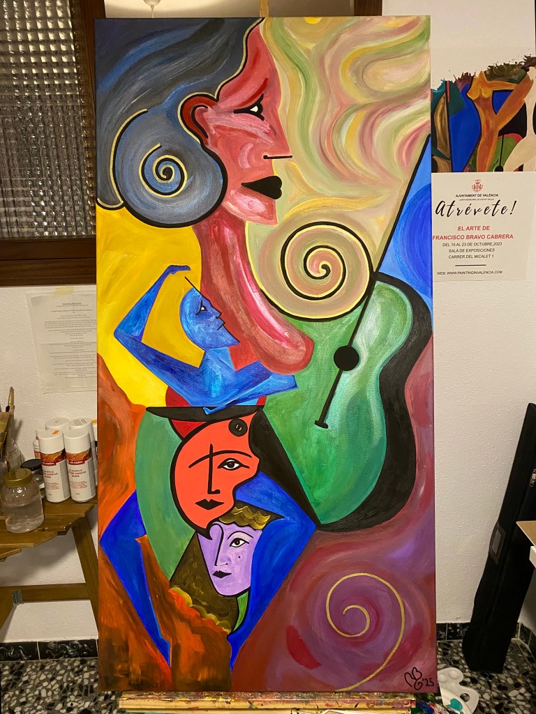 «Monserrate», mi nueva obra está hecha con acrílicos sobre una tela de 70 x 140 centímetros y la acabo de firmar. Tiene jazz, miradas y símbolos para quien los entienda. Coleccionistas deben contactar a «By Guloshka» (IG: @Guloshka).