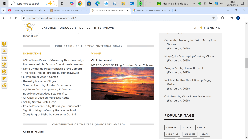Ha sido un gran honor haber ganado el premio de mejor publicación internacional del 2025 con mi poema «No te olvides de mi» y se lo debo a vuestro apoyo y que me habéis votado. Gracias, muchísimas gracias.