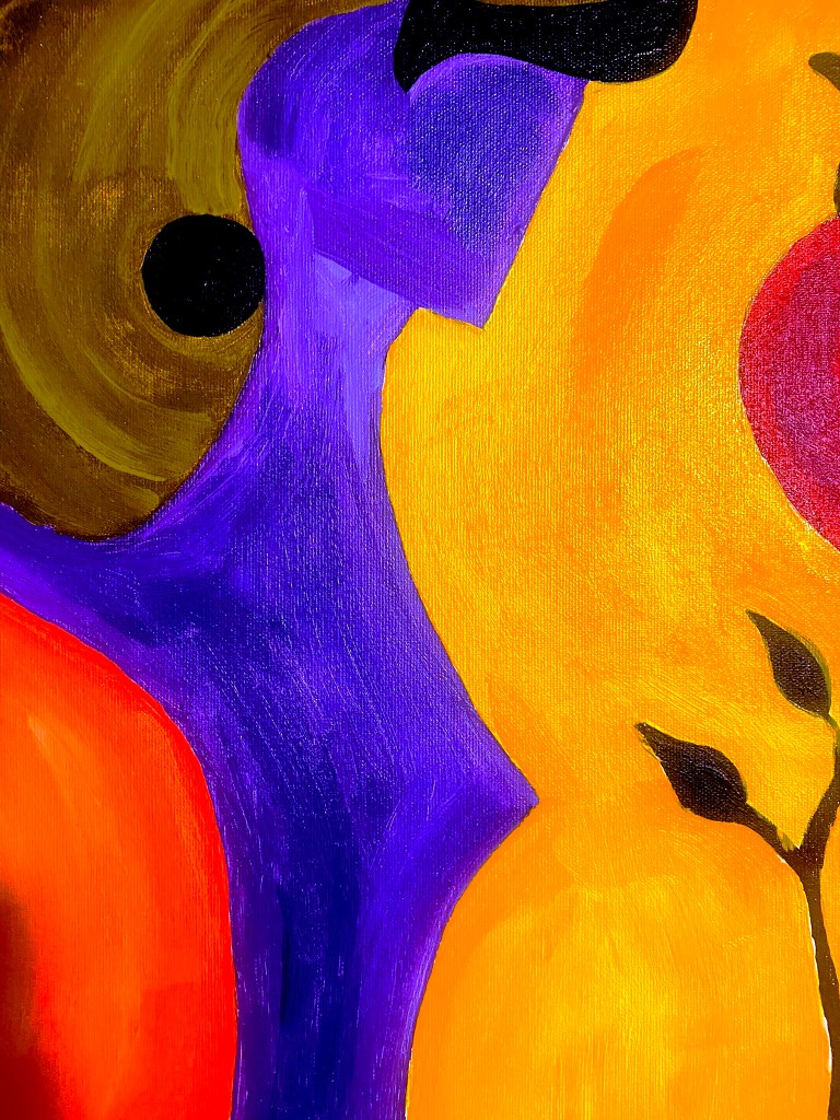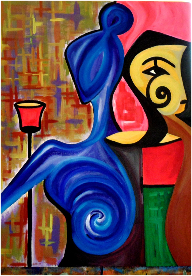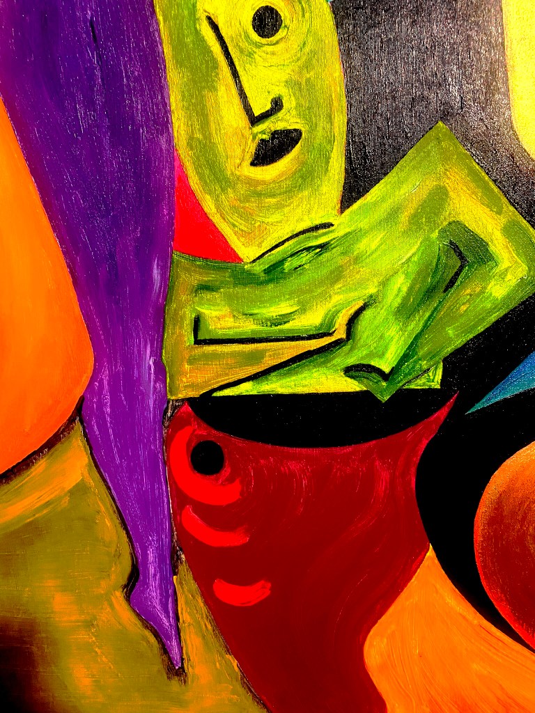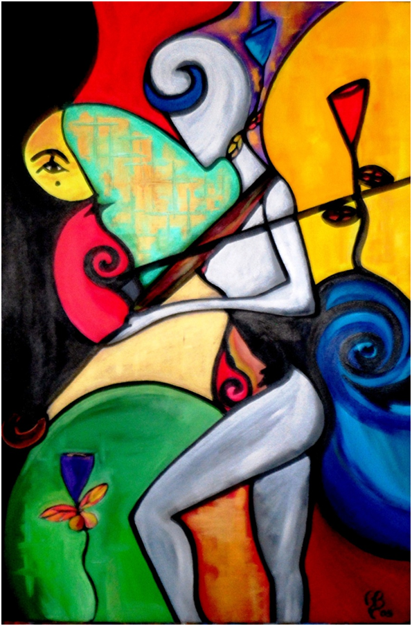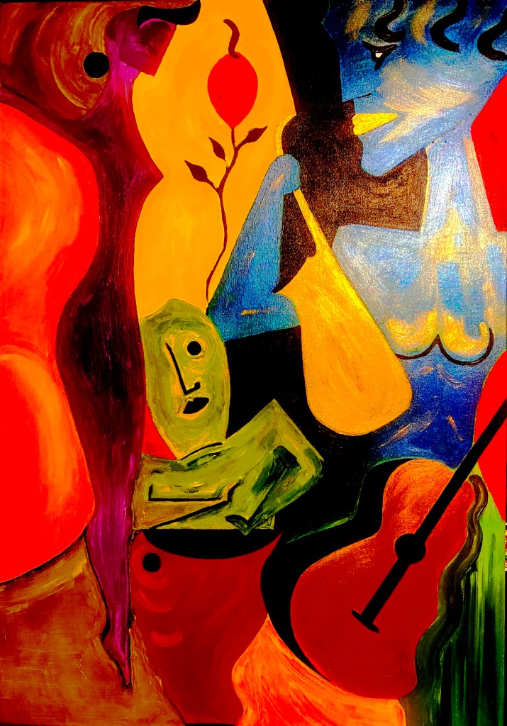 An example of early Surreal-Expressionism which keeps up precisely with the precepts of JaZzArt. I was still researching both at the time, (2007), when «Moño Azul» was painted. It is done with acrylics on canvas. The background is abstract and filled with color. The principal part of the composition is the blue silhouette of a woman whose hair is combed into a bun. She is looking to the right side towards a very stylized, Egyptian-style flower. To the left of the main part of the composition one sees the more surreal aspect of the painting where a face seems to hover above a hand-drum, symbolizing the creation of music which rises, like black smoke from the drum.
