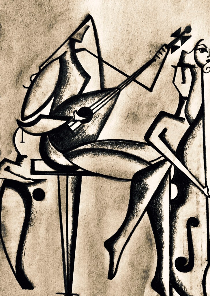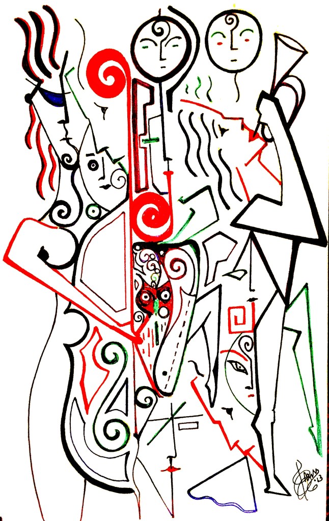 This ink on Cansol paper I did in 2013, still experimenting with the creation of Jazz Art, and it is symbolic of a jazz group jamming away. Rhythms start and flow, grow and diminish in their musical dynamics but the beat, an essential element of jazz still continues…